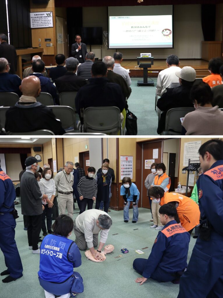 令和7年10月18日(土)に東札幌会館において町連防災研修会が開催されました。白石区民防災講座を受講した後、白石消防署による心肺蘇生法とAEDの扱い方を実習しました。天災は忘れた頃にやってくるといいますが、いざというときに備えて準備が必要ですね。(R7.10.18)